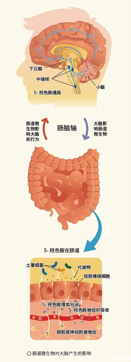 微生物自身可以產(chǎn)生神經(jīng)遞質(zhì),通過(guò)神經(jīng)細(xì)胞的傳導(dǎo)刺激中樞神經(jīng)系統(tǒng);此外,也可以請(qǐng)求場(chǎng)外支援,微生物通過(guò)產(chǎn)生活性物質(zhì)刺激內(nèi)分泌系統(tǒng),進(jìn)而誘導(dǎo)腸道細(xì)胞產(chǎn)生神經(jīng)遞質(zhì)。舉個(gè)例子,我們熟知的“快樂信使”——5-羥色胺,它的產(chǎn)生依賴于腸嗜鉻細(xì)胞。微生物可以通過(guò)影響腸嗜鉻細(xì)胞的數(shù)量或功能,進(jìn)而干預(yù)5-羥色胺釋放,并最終調(diào)節(jié)大腦的認(rèn)知、學(xué)習(xí)和記憶。