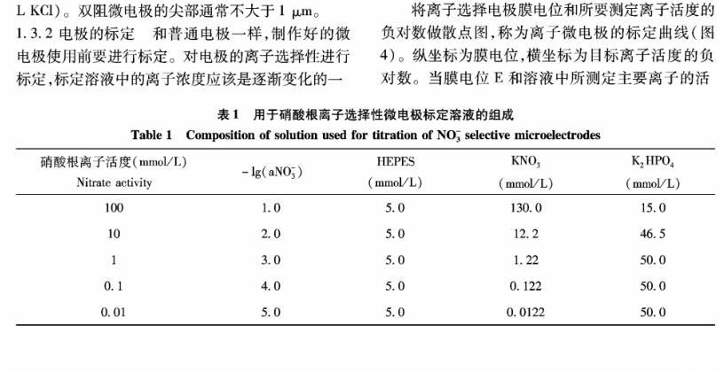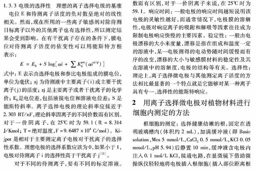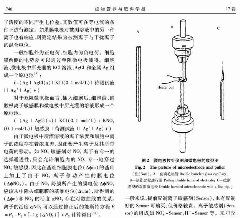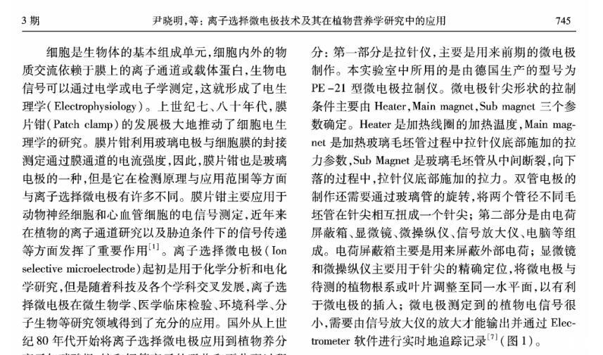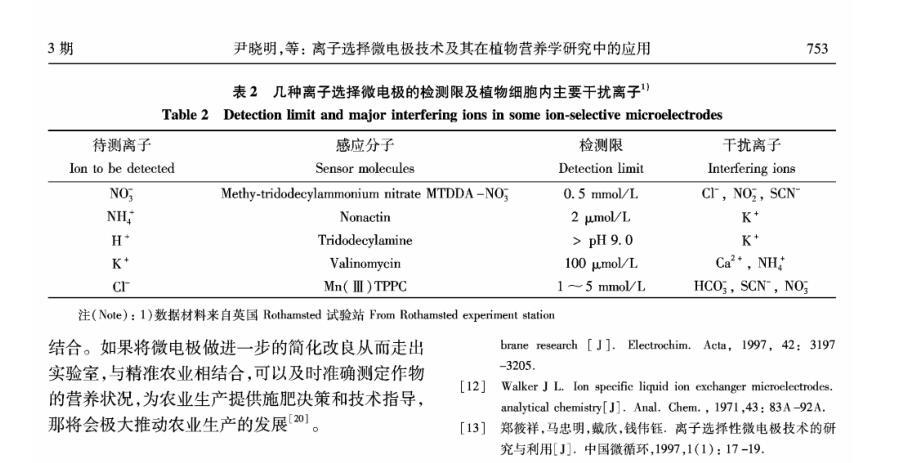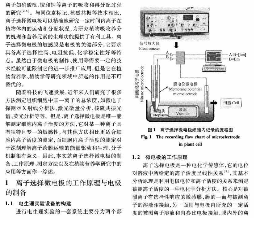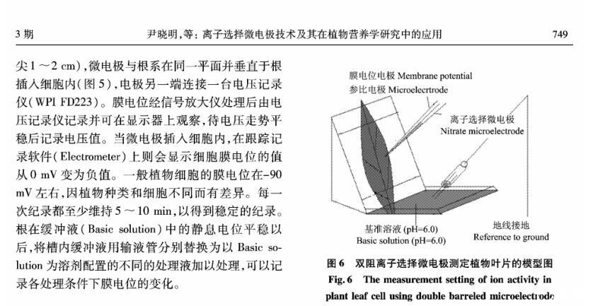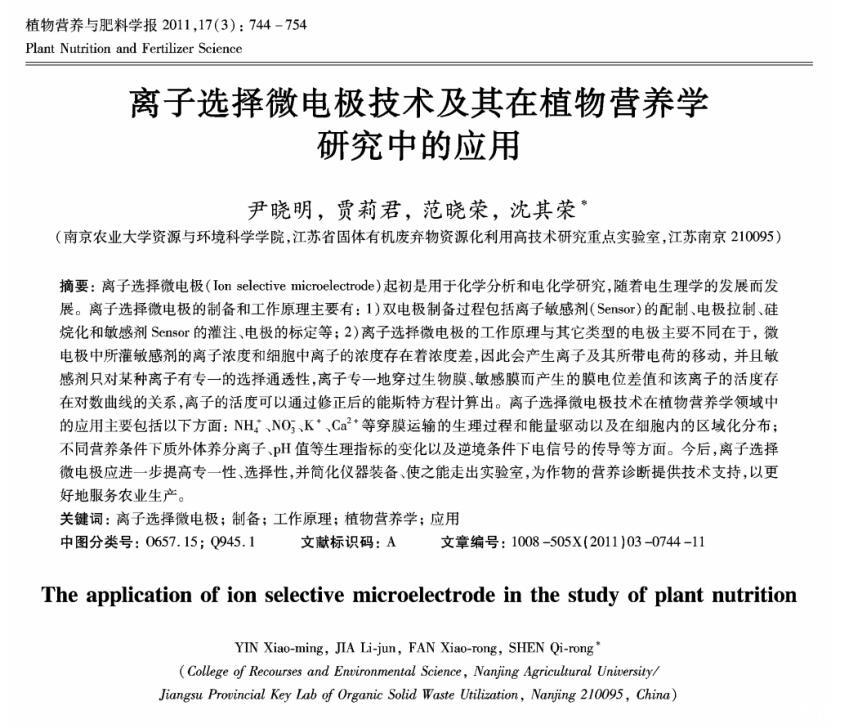 【摘要】:離子選擇微電極(Ion selective microelectrode)起初是用于化學分析和電化學研究,隨著電生理學的發展而發展。離子選擇微電極的制備和工作原理主要有:1)雙電極制備過程包括離子敏感劑(Sensor)的配制、電極拉制、硅烷化和敏感劑Sensor的灌注、電極的標定等;2)離子選擇微電極的工作原理與其它類型的電極主要不同在于,微電極中所灌敏感劑的離子濃度和細胞中離子的濃度存在著濃度差,因此會產生離子及其所帶電荷的移動,并且敏感劑只對某種離子有專一的選擇通透性,離子專一地穿過生物膜、敏感膜而產生的膜電位差值和該離子的活度存在對數曲線的關系,離子的活度可以通過修正后的能斯特方程計算出。離子選擇微電極技術在植物營養學領域中的應用主要包括以下方面:NH4+、NO3-、K+、Ca2+等穿膜運輸的生理過程和能量驅動以及在細胞內的區域化分布;不同營養條件下質外體養分離子、pH值等生理指標的變化以及逆境條件下電信號的傳導等方面。今后,離子選擇微電極應進一步提高專一性、選擇性,并簡化儀器裝備、使之能走出實驗室,為作物的營養診斷提供技術支持,以更好地服務農業生產。