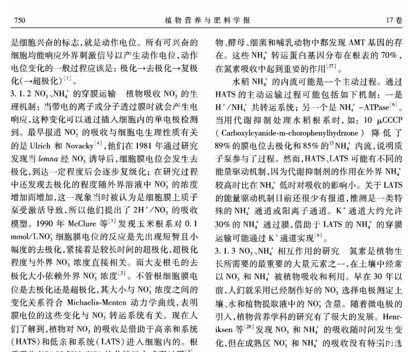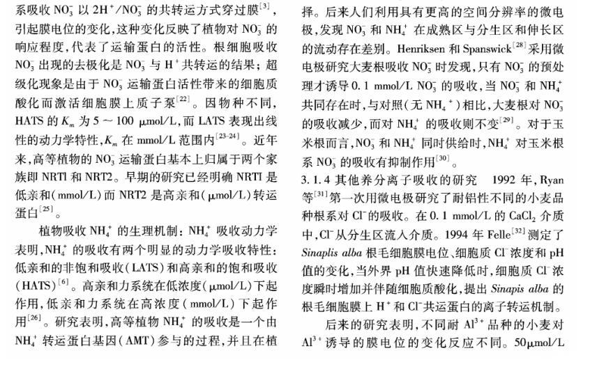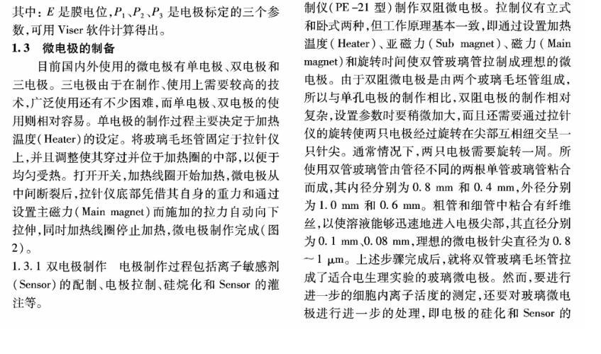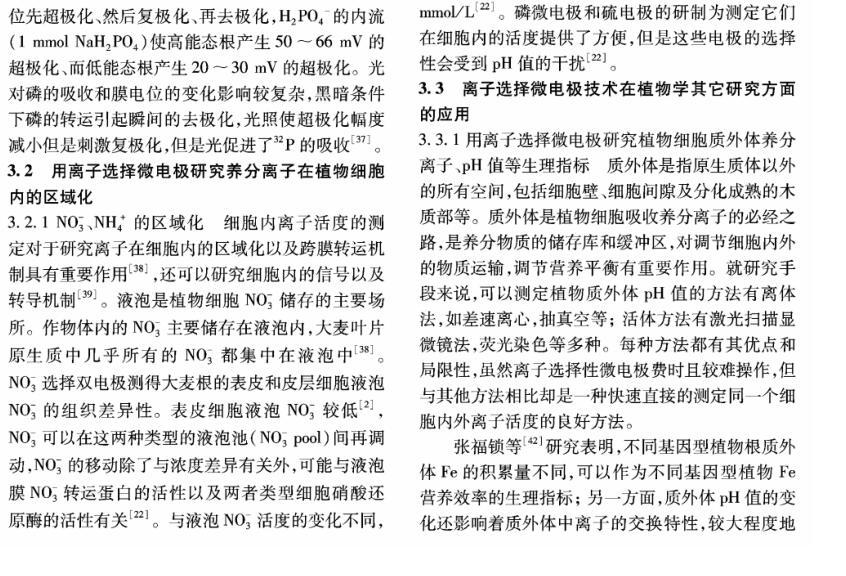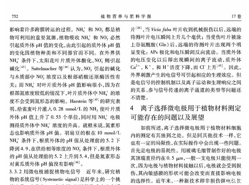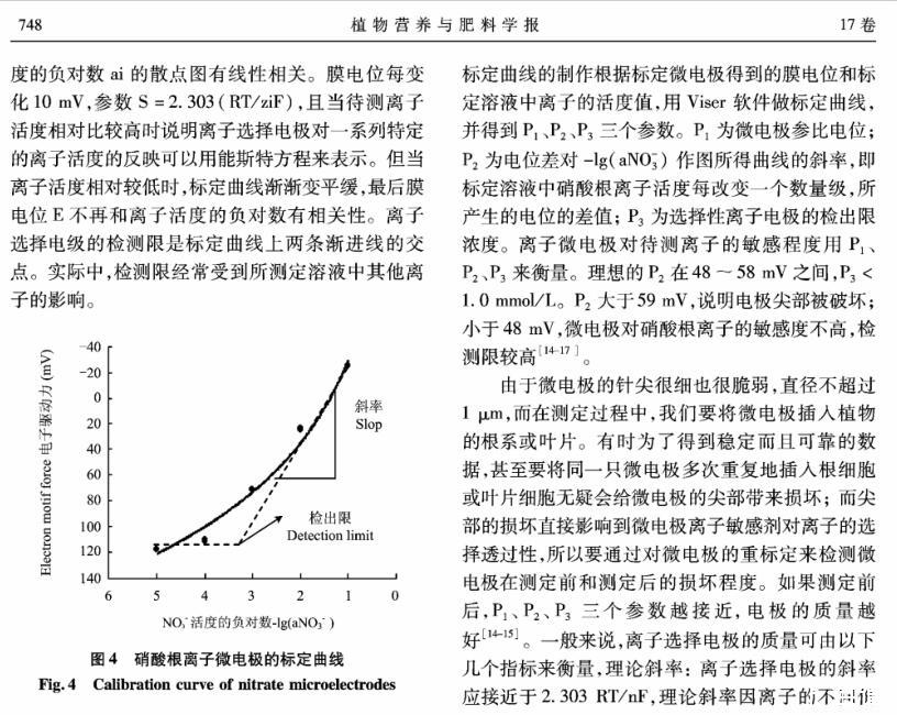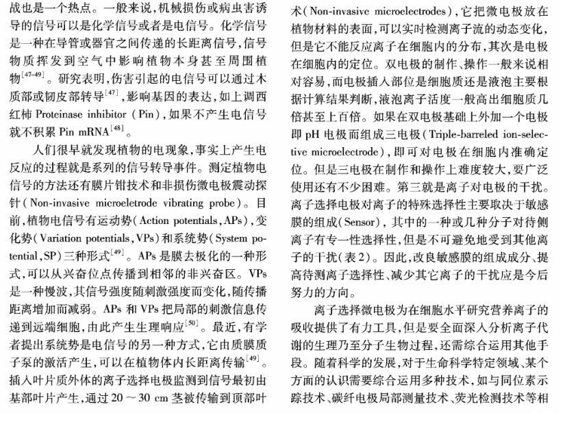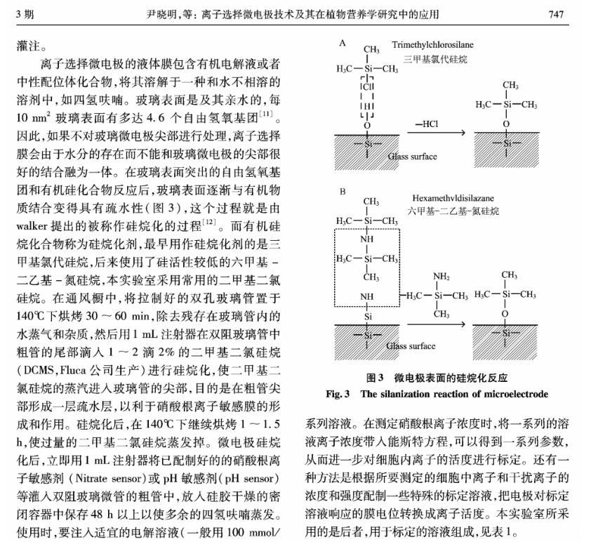 【摘要】:離子選擇微電極(Ion selective microelectrode)起初是用于化學分析和電化學研究,隨著電生理學的發展而發展。離子選擇微電極的制備和工作原理主要有:1)雙電極制備過程包括離子敏感劑(Sensor)的配制、電極拉制、硅烷化和敏感劑Sensor的灌注、電極的標定等;2)離子選擇微電極的工作原理與其它類型的電極主要不同在于,微電極中所灌敏感劑的離子濃度和細胞中離子的濃度存在著濃度差,因此會產生離子及其所帶電荷的移動,并且敏感劑只對某種離子有專一的選擇通透性,離子專一地穿過生物膜、敏感膜而產生的膜電位差值和該離子的活度存在對數曲線的關系,離子的活度可以通過修正后的能斯特方程計算出。離子選擇微電極技術在植物營養學領域中的應用主要包括以下方面:NH4+、NO3-、K+、Ca2+等穿膜運輸的生理過程和能量驅動以及在細胞內的區域化分布;不同營養條件下質外體養分離子、pH值等生理指標的變化以及逆境條件下電信號的傳導等方面。今后,離子選擇微電極應進一步提高專一性、選擇性,并簡化儀器裝備、使之能走出實驗室,為作物的營養診斷提供技術支持,以更好地服務農業生產。