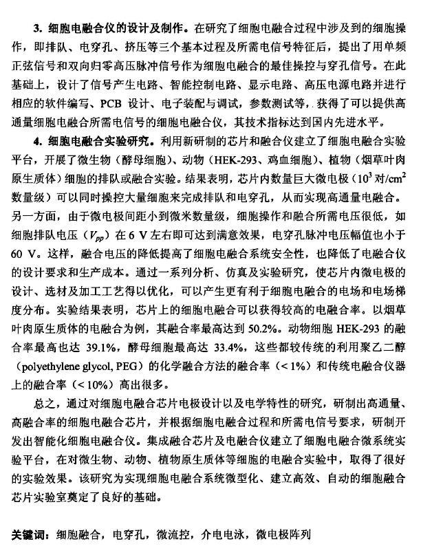 4.細(xì)胞電融合實(shí)驗(yàn)研究。利用新研制的芯片和融合儀建立了細(xì)胞電融合實(shí)驗(yàn)平臺(tái),開展了微生物(酵母細(xì)胞)、動(dòng)物(HEK-293、雞血細(xì)胞)、植物(煙草葉肉原生質(zhì)體)細(xì)胞的排隊(duì)或融合實(shí)驗(yàn)。結(jié)果表明,芯片內(nèi)數(shù)量巨大微電極(103對(duì)/cm2數(shù)量級(jí))可以同時(shí)操控大量細(xì)胞來完成排隊(duì)和電穿孔,從而實(shí)現(xiàn)高通量電融合。另一方面,由于微電極間距小到微米數(shù)量級(jí),細(xì)胞操作和融合所需電壓很低,如細(xì)胞排隊(duì)電壓(Vpp)在6 V左右即可達(dá)到滿意效果,電穿孔脈沖電壓幅值也小于60 V。這樣,融合電壓的降低提高了細(xì)胞電融合系統(tǒng)安全性,也降低了電融合儀的設(shè)計(jì)要求和生產(chǎn)成本。通過一系列分析、仿真及實(shí)驗(yàn)研究,使芯片內(nèi)微電極的設(shè)計(jì)、選材及加工工藝得以優(yōu)化,可以產(chǎn)生更有利于細(xì)胞電融合的電場(chǎng)和電場(chǎng)梯度分布。實(shí)驗(yàn)結(jié)果表明,芯片上的細(xì)胞電融合可以獲得較高的電融合率。以煙草葉肉原生質(zhì)體的電融合為例,其融合率最高達(dá)到50.2%。動(dòng)物細(xì)胞HEK-293的融合率最高也達(dá)39.1%,酵母細(xì)胞最高達(dá)33.4%,這些都較傳統(tǒng)的利用聚乙二醇(polyethylene glycol,PEG)的化學(xué)融合方法的融合率(1%)和傳統(tǒng)電融合儀器上的融合率(10%)高出很多。總之,通過對(duì)細(xì)胞電融合芯片電極設(shè)計(jì)以及電學(xué)特性的研究,研制出高通量、高融合率的細(xì)胞電融合芯片,并根據(jù)細(xì)胞電融合過程和所需電信號(hào)要求,研制開發(fā)出智能化細(xì)胞電融合儀。集成融合芯片及電融合儀建立了細(xì)胞電融合微系統(tǒng)實(shí)驗(yàn)平臺(tái),在對(duì)微生物、動(dòng)物、植物原生質(zhì)體等細(xì)胞的電融合實(shí)驗(yàn)中,取得了很好的實(shí)驗(yàn)效果。該研究為實(shí)現(xiàn)細(xì)胞電融合系統(tǒng)微型化、建立高效、自動(dòng)的細(xì)胞融合芯片實(shí)驗(yàn)室奠定了良好的基礎(chǔ)。