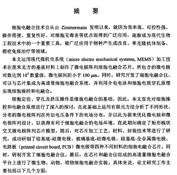 【摘要】:細(xì)胞電融合技術(shù)自從由Zimmermann發(fā)明以來,就因?yàn)樾矢摺⒖煽匦詮?qiáng)、操作簡(jiǎn)便、重復(fù)性好、對(duì)細(xì)胞無毒害等優(yōu)點(diǎn)而得到廣泛應(yīng)用,逐漸成為現(xiàn)代生物工程技術(shù)中的一個(gè)重要工具,被廣泛應(yīng)用于物種產(chǎn)生或改良、單克隆抗體制備、癌癥免疫治療等領(lǐng)域。本文運(yùn)用現(xiàn)代微機(jī)電系統(tǒng)(micro electro mechanical systems,MEMS)加工技術(shù)在厘米見方的基底材料上制作了微電極陣列細(xì)胞電融合芯片。所包含的微電極對(duì)數(shù)達(dá)到103數(shù)量級(jí),微電極間距小于100μm。同時(shí),研究開發(fā)了細(xì)胞電融合儀,可以與芯片集成為高通量細(xì)胞電融合系統(tǒng),并利用介電電泳和細(xì)胞電致穿孔原理實(shí)現(xiàn)細(xì)胞操控和電融合。細(xì)胞定位、穿孔及擠壓操作是細(xì)胞電融合的基礎(chǔ)。因此,本文首先對(duì)細(xì)胞操控和電融合原理進(jìn)行了深入的探討,在此基礎(chǔ)上運(yùn)用有限元方法分析了不同形狀、分布的微電極陣列在外加電壓條件下的電場(chǎng)分布,并以此為據(jù)來優(yōu)化微電極和微電極陣列設(shè)計(jì),以獲得有利于細(xì)胞電融合的電場(chǎng)環(huán)境。在此期間確定了矩形梳狀交叉微電極陣列芯片模型。