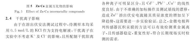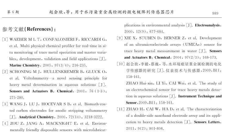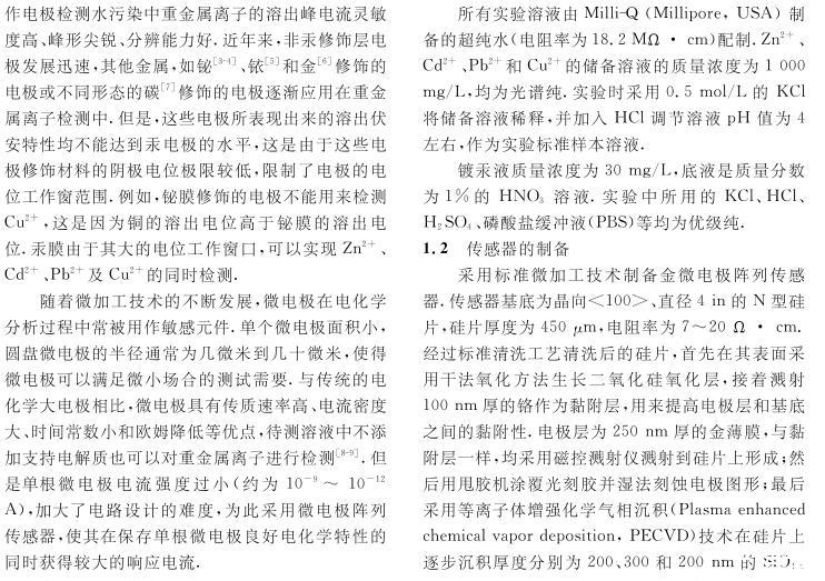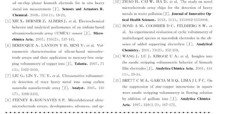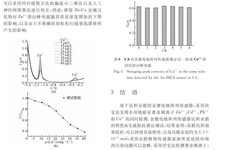 【摘要】:基于溶出伏安法,采用一種新型的汞膜金微電極陣列傳感器芯片,實現了水污染痕量重金屬離子Zn2+、Cd2+、Pb2+和Cu2+的同時檢測.在K3[Fe(CN)6]溶液中對微電極陣列傳感器進行循環伏安掃描,分析其電化學特性及實際表面積,采用電化學阻抗譜法檢驗微電極陣列傳感器表面汞膜沉積的程度。鍍汞后的微電極陣列傳感器采用差分脈沖陽極溶出伏安法,同時檢測樣本溶液中的重金屬元素:Zn2+、Cd2+、Pb2+和Cu2+,得到的Cd2+、Pb2+和Cu2+的標準工作曲線線性度良好,檢測下限分別為0.1、0.5和0.3μg/L,但Zn2+的標準工作曲線線性度較差,這主要是由測試基線的漂移及不準確的加標造成的。