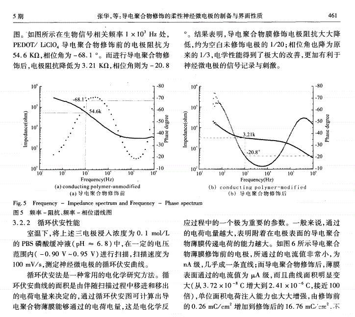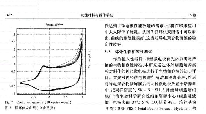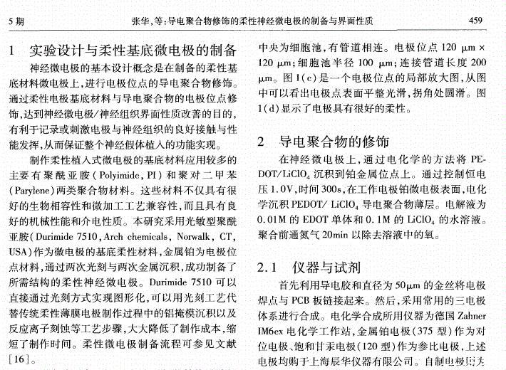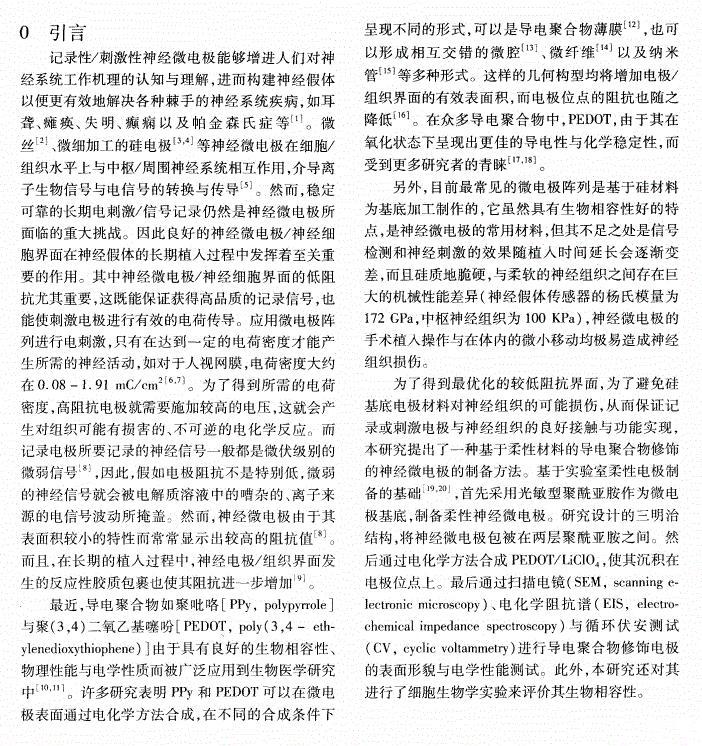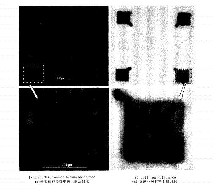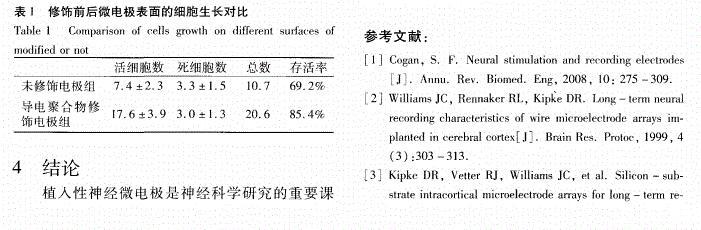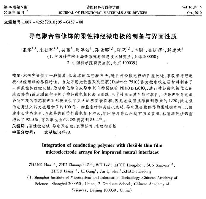 結果表明導電聚合物粗糙的菜花狀表面形貌提供了更大的界面表面積,因此電極阻抗降低到原來的1/20,微電極的電荷注入能力也增加了約100倍。細胞生物學實驗也表明,導電聚合物修飾的柔性微電極上,細胞生長狀態(tài)良好,與未修飾的柔性微電極下相比,粘附率與存活率均有明顯改善,粘附率較修飾前增加了92.5%,存活率也由69.2%提高到85.4%。