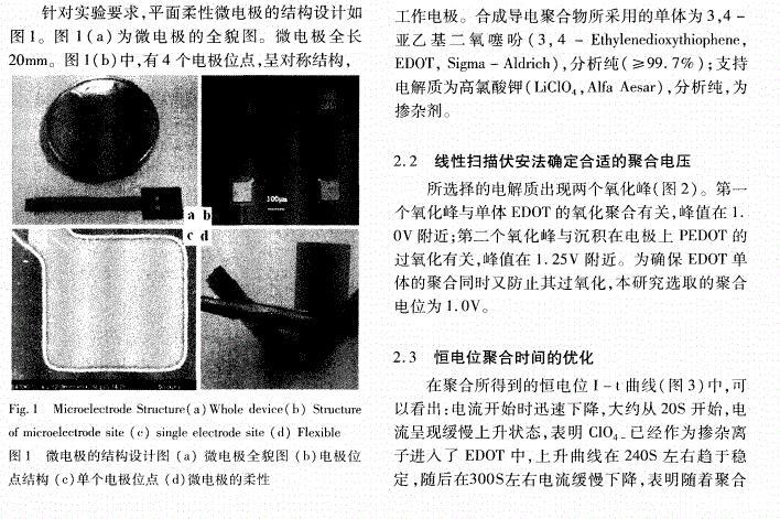 【摘要】:本研究提供了一種簡易、低成本的工藝和方法,進行神經(jīng)微電極的性能改進,來改善神經(jīng)電極/神經(jīng)組織的界面特性。首先采用光敏型聚酰亞胺(Durimide 7510)作為微電極基質材料制備了一種柔性神經(jīng)微電極;然后電化學合成導電聚合物聚噻吩PEDOT/LiClO4,進行神經(jīng)微電極位點的表面修飾;最后測試和評價了神經(jīng)微電極的表面形貌、電學性能及其生物相容性。
