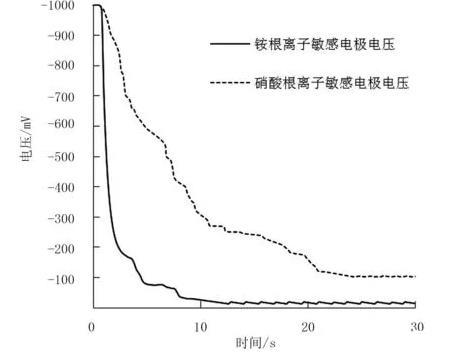 采用所研制的多管離子選擇性微電極對其設施栽培番茄葉片樣本中NO3-及NH4+濃度進行測試,測得的NO3-和NH4+的離子敏感電極信號穩定后,其電壓值分別為-103.84 mV和-16.53mV,如圖4所示。根據NO3-和NH4+選擇性微電極的標定曲線,計算出番茄葉片內NO3-和NH4+的濃度分別為0.20mmol/L和0.51mmol/L,轉換成總氮質量比濃度,得番茄葉片中含氮量為25.00mg/g。
