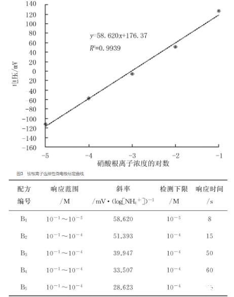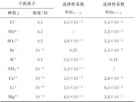 對國內外市場上已有的硝酸根離子、銨根離子敏感劑或離子敏感劑配方進行篩選,根據離子選擇性、斜率、響應時間、重現性及穩定性等指標確定最適宜的離子選擇性敏感膜。