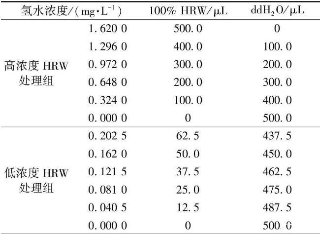 將純水氫氣發生器制得的氫氣(99.999%)通入100 mL超純水(ddH2O)中以制備HRW,每隔10 min使用氫氣微電極測定一次,直至飽和,氫氣在20℃下溶解度為1.62 mg·L-1[20]。制得飽和HRW后,立即使用ddH2O稀釋,配制成不同濃度的HRW(表1)以用于測定標準曲線,溶液總體系為500.0μL。
