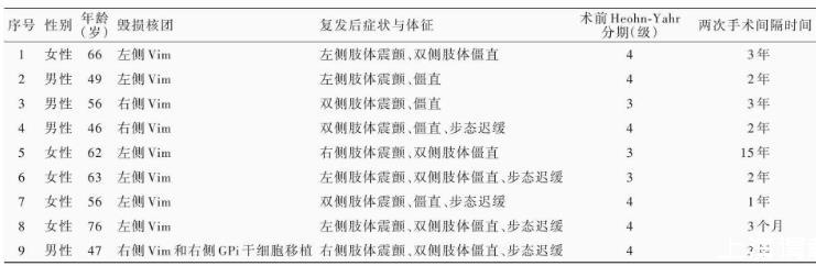 腦深部電刺激術(DBS)和神經核團毀損術是目前治療運動障礙性疾病的主要外科手術方法[1]。既往研究顯示,神經核團毀損術治療運動障礙性疾病有效,但隨著疾病進展,部分患者可因癥狀復發甚至加重而需接受進一步治療[2]。與神經核團毀損術相比,腦深部電刺激術具有手術損傷可逆、電極參數可調節等優點[1?2],已逐漸成為神經核團毀損術后癥狀復發患者外科治療的替代性選擇。中國科學技術大學附屬第一醫院神經外科共對9例蒼白球或丘腦毀損術后癥狀復發的帕金森病患者再次行腦深部電刺激術治療,療效滿意,結果報告如下。