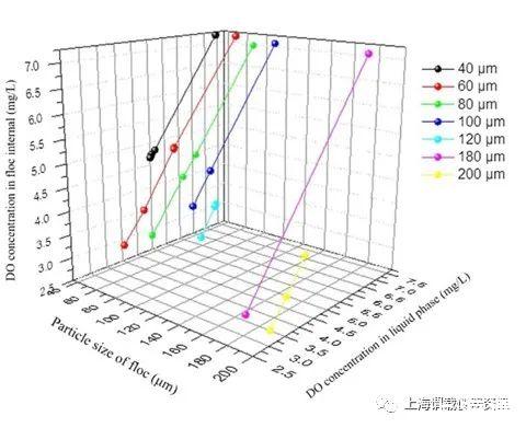 圖3、不同粒徑和溶解氧濃度絮體的內溶解氧衰減值。當選取不同粒徑(40、60、80、100、120、180、200μm)的活性污泥絮體樣品(SRT=10 d),研究不同液體下DO濃度的衰減情況-階段條件。根據實圖中的驗數據,DO濃度的衰減隨著液相中DO濃度的降低而增加。其主要原因是液相中溶解氧濃度越低,氧轉移驅動力越小,氧越難擴散到絮凝體內部。此外,在較高的溶解氧條件下,溶解氧很容易穿透絮體,氧的擴散基本不受限制。還表明溶解氧濃度的衰減隨著污泥粒徑的增加而增加。