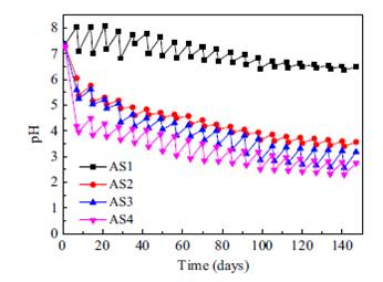 圖4、不同濃度污水樣品對(duì)應(yīng)的pH值隨時(shí)間的變化情況