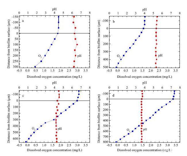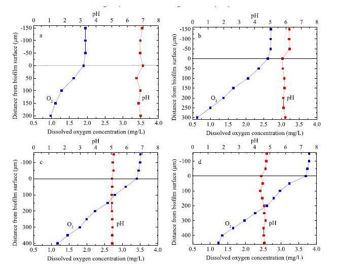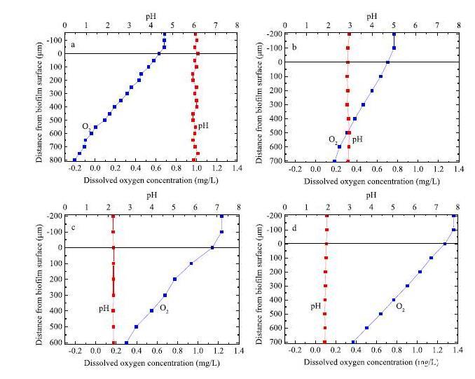 圖6、生長在不同污水(a)BS1,(b)BS2,(c)BS3,(d)BS4)的生物膜30天后,應(yīng)用unisense微電極穿刺生物膜表面的氧濃度剖面及pH值剖面。