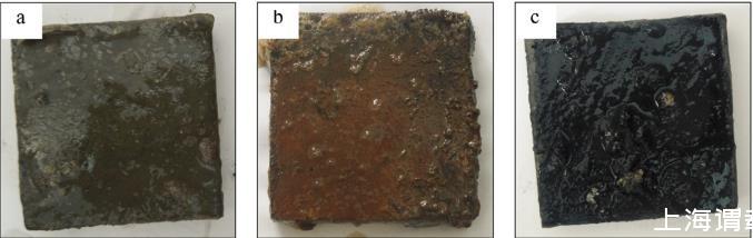 圖2、砂漿載體生物膜不同生長周期(圖a 5天;圖b15;圖c 30天)對(duì)應(yīng)的的表觀形態(tài)。