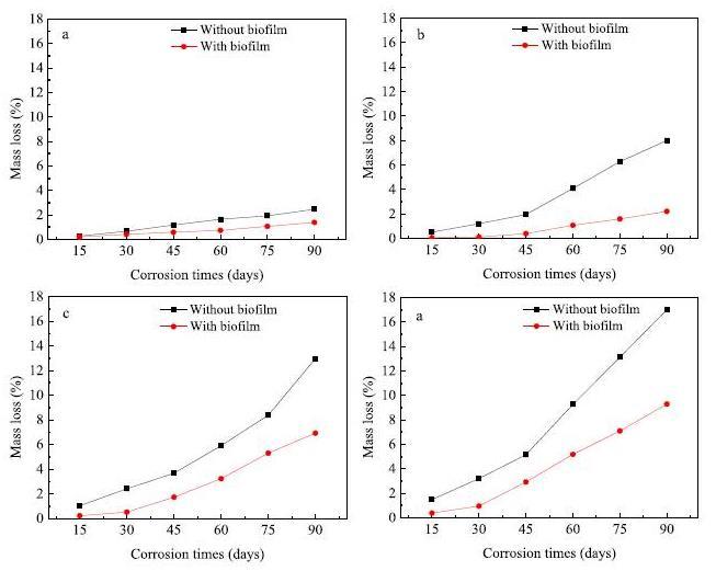 實(shí)驗(yàn)結(jié)果:采用人工強(qiáng)化處理污水的方法,模擬和加速了污水中微生物的腐蝕,研究了污水中摻加生物膜和不摻生物膜砂漿的重量變化規(guī)律。對(duì)比研究了砂漿上生物膜的微生物結(jié)構(gòu)和活性表面。在此基礎(chǔ)上,分析了生物膜對(duì)砂漿老化的影響機(jī)理。結(jié)果表明,在砂漿上形成的生物膜有污水導(dǎo)致的不同程度的腐蝕具有一定的阻隔作用。研究發(fā)現(xiàn)生物膜對(duì)砂漿惡化的影響機(jī)制可進(jìn)行定量分析,可以發(fā)現(xiàn)和主要影響因素。在第1個(gè)月,普通污水(COD=300 mg/L)中的樣品生物膜作用系數(shù)(BA)最低,主要是由于其生物膜較薄,但一直增加到60天。對(duì)于強(qiáng)化污水中的試樣,在整個(gè)腐蝕過程中,MS2的BA值最高,這可以解釋為其污水和生物膜的pH值較高,而MS3和MS4由于其生物膜結(jié)構(gòu)致密,在第一個(gè)月的BA值較高,在此之后,不斷增加的腐蝕性降低了生物膜對(duì)砂漿的保護(hù)作用,使得BA值大大降低。這也說明對(duì)于普通污水中的樣品,生物膜的厚度起著主要作用,尤其是在第一個(gè)月,而在污水濃度過高的情況下,污水的腐蝕性增加對(duì)后期生物膜對(duì)砂漿的防護(hù)作用會(huì)明顯降低。