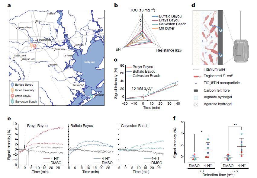 圖4、a,美國休斯頓城市水道采樣點地圖。b,將每個樣品的pH、溶液電阻和總有機碳(TOC)測量值與M9介質進行比較。pH范圍為6.85至8.04,溶液電阻范圍為0.044至3.787 kΩ,TOC范圍為0至17.05 mg l?1。c,I+C+O+電流響應相對于I C42A C+使用每個環境樣品在2-EWE配置的BES中添加硫代硫酸鹽后。數據代表每個環境樣本中單個實驗的值。時間為零表示添加硫代硫酸鹽。d,示意圖說明用TiO2 TiN納米顆粒封裝傳感器以提高EET效率。e,I S C+O+電流響應相對于I C42A C+在使用每個環境樣本的2-EWE配置的BES中添加4-HT或DMSO后。時間為零表示添加4-HT或DMSO。f,環境樣品中4-HT的檢測時間,置信度為*95%(P=0.034)和**99%(P=7.6×10?3)。數據代表在布雷斯河口(紅色)、布法羅河口(藍色)和加爾維斯頓海灘(綠色)的環境樣本中觀察到的值,誤差線代表標準差(n=6)。