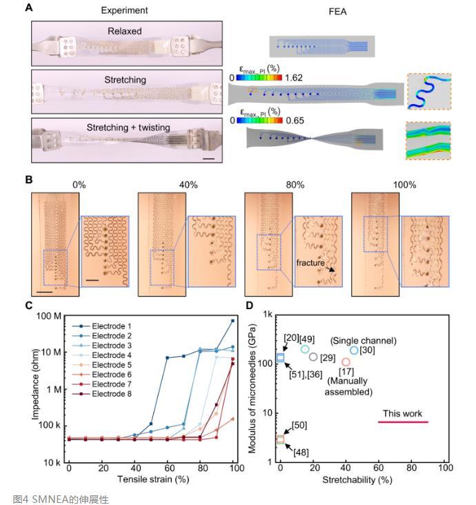 與彈性基底共價(jià)鍵合的微針和蛇形互連使SMNEA具有機(jī)械拉伸性。圖4A顯示了SMNEA在拉伸(66%拉伸應(yīng)變)和拉伸(30%拉伸應(yīng)變)與扭曲(180°旋轉(zhuǎn))組合變形下的情況。有限元分析(FEA)提供了SMNEA構(gòu)成材料中的定量應(yīng)變分布。在66%拉伸試驗(yàn)中,PI-2610層的最大主應(yīng)變峰值出現(xiàn)在蛇形邊緣附近,達(dá)到1.62%。在拉伸和扭曲聯(lián)合試驗(yàn)中,PI的最大主應(yīng)變峰值約為0.65%,位于蛇形互連區(qū)域的末端附近。SMNEA的單軸拉伸測(cè)試提供了有關(guān)其拉伸極限的詳細(xì)信息。圖4B顯示了一個(gè)具有代表性的SMNEA器件在單軸拉伸下的一系列側(cè)視光學(xué)圖像,該器件的尖端有鉑銠涂層,器件浸入PBS中進(jìn)行電阻抗測(cè)量。拉伸單排微針電極會(huì)導(dǎo)致它們之間的距離增加,蛇形互連線變直。電極阻抗在低于40%應(yīng)變時(shí)基本保持不變,而在60%至90%應(yīng)變時(shí)阻抗會(huì)顯著增加(圖4C)。在此應(yīng)變范圍內(nèi),蛇形互連器件PI層的最大主應(yīng)變值接近其斷裂極限(1.76%),從而導(dǎo)致蛇形互連器件斷裂(圖4B)。金層的應(yīng)變保持在1%至2%的斷裂極限范圍內(nèi),這表明拉伸性是由PI層決定的。不同電極拉伸性的測(cè)量差異可能源于PI薄膜制造和圖案化的不完美以及局部應(yīng)變的差異。SMNEA的高拉伸性和低拉伸剛度(低于60%應(yīng)變時(shí)約為7N/m)使其能夠跟隨軟靶材料的變形而穩(wěn)定地插入微針,并減少施加到靶材上的機(jī)械應(yīng)力。SMNEA60%至90%的拉伸性明顯高于其他SMNEA(圖4D)。有報(bào)道稱,使用硅或不銹鋼等更堅(jiān)硬的微針材料制成的微針電極陣列具有40%至45%的伸展性;然而,這種微針陣列要么不可定位,要么需要手動(dòng)組裝。通過優(yōu)化蛇形互連的設(shè)計(jì),可以進(jìn)一步提高SMNEA的可拉伸性。PI微針的楊氏模量可確保插入軟組織時(shí)不會(huì)發(fā)生彎曲,同時(shí)與金屬和硅微針相比,其機(jī)械失配更小,從而減少了潛在的組織損傷。本文介紹的制造方案可應(yīng)用于模量較高的材料,以制造用于較硬靶組織的微針,如聚合物復(fù)合材料或電鍍金屬。