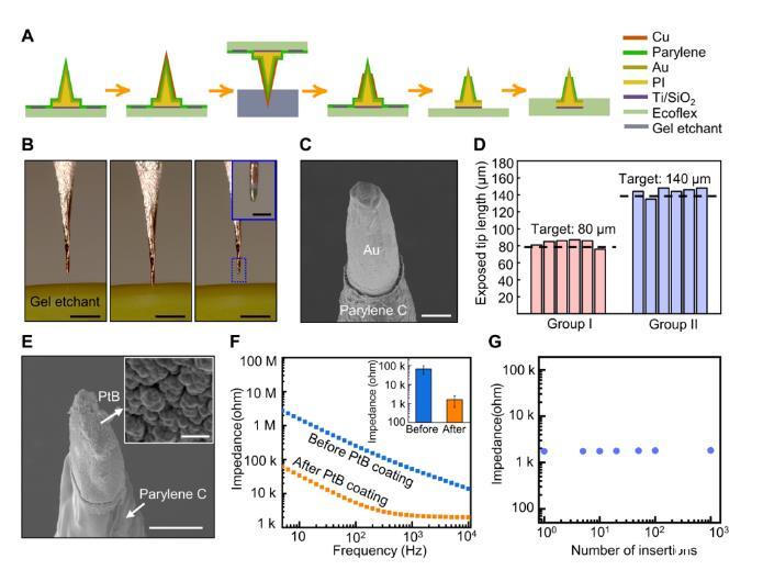 通過調(diào)整微針插入凝膠蝕刻液的深度,可以控制尖端蝕刻銅的長(zhǎng)度。移除頂端的銅硬掩膜后,氧等離子體蝕刻對(duì)二甲苯涂層,選擇性地露出金層(圖3C)。使用凝膠蝕刻劑而不是液相FeCl3/HCl蝕刻劑,可以最大限度地減少液體蝕刻劑因液體潤(rùn)濕銅表面而沿微針表面擴(kuò)散的情況。在插入凝膠蝕刻液5-10秒的情況下,蝕刻液的擴(kuò)散距離約為20μm,插入時(shí)間越長(zhǎng),擴(kuò)散速度越慢,擴(kuò)散距離僅略有增加。這與浸泡在液相FeCl3/HCl溶液中的微針在幾秒鐘內(nèi)就完全鋪滿蝕刻液形成鮮明對(duì)比。凝膠蝕刻液在銅表面上的液體蝕刻液擴(kuò)散速度相對(duì)較慢,這是因?yàn)橐后w通過納米多孔瓊脂糖凝膠時(shí)會(huì)產(chǎn)生粘性阻力。目標(biāo)長(zhǎng)度為80μm(第一組)和140μm(第二組)的暴露針尖的測(cè)量長(zhǎng)度分別為81.5±5.5μm和141.5±6.5μm(圖3D)。這種凝膠輔助蝕刻方法的獨(dú)特之處在于它能控制不同長(zhǎng)度微針的針尖暴露,只要將凝膠蝕刻劑塑造成窄立方體,然后將單個(gè)微針分別插入其中就能輕松實(shí)現(xiàn)。通過視覺自動(dòng)插入或創(chuàng)建預(yù)定高度的凝膠蝕刻劑圖案,也可以對(duì)大量微針的針尖進(jìn)行可控蝕刻。
