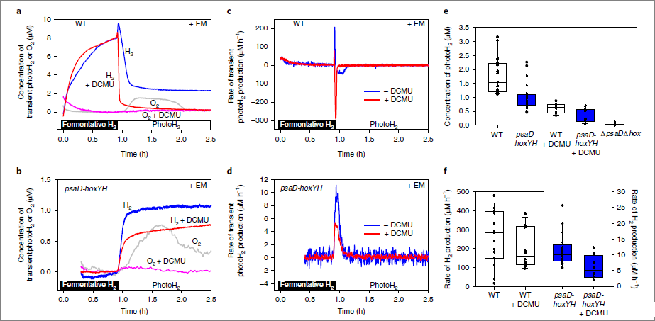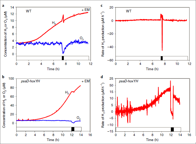圖4、在連續光下,厭氧條件下WT和psaD-hoxYH中持久光和產H 2對光的依賴性。通過添加葡萄糖,葡萄糖氧化酶和過氧化氫酶(EM)來維持無氧條件。圖的底部用黑色(熄滅)和白色(點亮)框表示照明條件。a,b,WT(a)和psaD-hoxYH(b)中光合產H2和氧的濃度。c,d,WT(c)和psaD-hoxYH(d)中光合產H2的的速率。