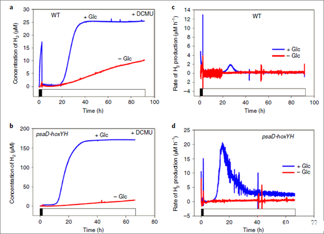圖5、在DCMU存在下,WT和psaD-hoxYH中對葡萄糖依賴性及持久的光和產H 2。通過在開始測量之前用氬氣吹掃培養物10分鐘來達到厭氧條件。a,b,WT(a)和psaD-hoxYH(b)中的光合產H2濃度。c,d,WT(c)和psaD-hoxYH(d)中的光和產H 2的生產率。圖的底部用黑色(熄滅)和白色(點亮)框表示照明條件。