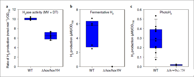 提出了一種通過與PSI融合的氫化酶光學生產H 2的體內方法,作為進一步的概念驗證。所得突變體psaD-hoxYH產生500μM光學產H2,這是目前為止報道的藍細菌光學產氫的最高濃度。突變體的新陳代謝提供自我修復,維持和復制,從而產生持久耐用的光學產氫的生產系統。藍藻Synechocstis sp.PCC 6803的NiFe-氫化酶HoxYH與其光系統I亞基PsaD融合,靠近4Fe4S簇FB,通常為鐵氧還蛋白提供電子,所得的psaD-hoxYH突變體以光養方式生長,在厭氧條件下,在太陽光的厭氧條件下實現500μM高濃度光合產氫,且不吸收產生的氫。相關數據表明,psaD-hoxYH中光合氫的產生最有可能是基于有氧和無氧光合作用。