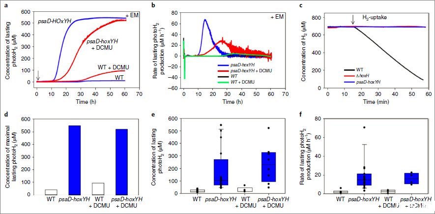 圖3、在不存在和存在DCMU的情況下,在連續光照下厭氧條件下,WT和psaD-hoxYH中持久的體內光和產H2。通過添加葡萄糖,葡萄糖氧化酶和過氧化氫酶來達到厭氧條件。a,在WT和psaD-hoxYH中長期光和產H2。b,WT和psaD-hoxYH中持久的光和產H2的速率。c,將WT,ΔhoxH和psaD-hoxYH與700μM H 2在黑暗中于厭氧條件下孵育。在箭頭指示的時間打開燈以測量H 2攝取,H2攝取存在于WT中,但在兩個突變體中都完全不存在。d,由WT和psaD-hoxYH生產的持久光和產H2的最大濃度。e,由WT(n=8,–DCMU;n=5,+DCMU)和psaD-hoxYH(n=16,–DCMU;n=8,+DCMU)產生的持久光和產H 2的平均濃度。從不同的樣品中進行測量;n代表樣本數。F,在WT生產(n=6,-DCMU;n=3,+DCMU)和PSAD-hoxYH(n=19,-DCMU;?=4,+DCMU)持久光和產H2的平均速率。