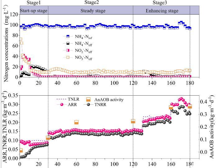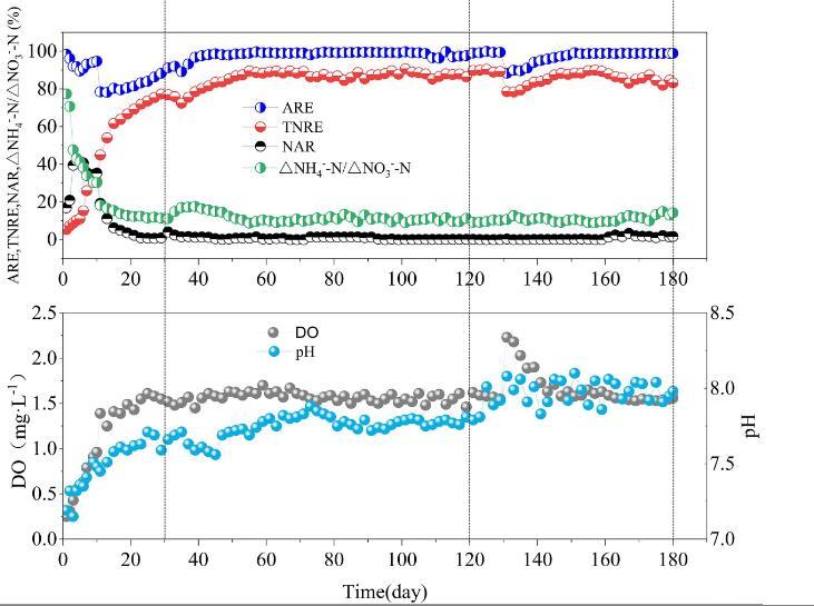 圖2、PN-A工藝的啟動和增強(TNLR表示總氮負荷率,ARR表示氨去除率,TNRR表示總氮去除率,ARE表示氨去除率,TNRE表示總氮去除率,NAR表示亞硝酸鹽積累率,△NO3–-N/△NH4+-N表示除去氨后產生的硝酸鹽。檢測出水的pH值。DO濃度是循環氧化階段的平均值。從圖中可看出AOB活動一開始就保持在高位,ARE為98.4%。DO濃度增加而ARE減少結果表明,COD在一開始是有氧消耗的,而之后可能在生物膜內發生厭氧氨氧化或異養反硝化,NOB被部分抑制。