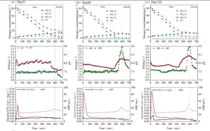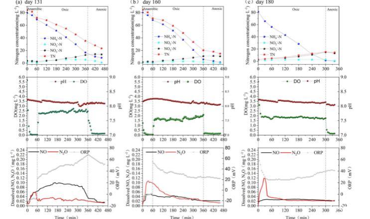 圖4、NH4+-N、NO3–-N和NO2–-N、pH、DO、ORP、溶解NO和溶解N2O在強化階段(a)第131天(強化第1天)的典型循環中的變化階段),(b)第160天(增強階段第30天),(c)第180天(增強階段第50天)。