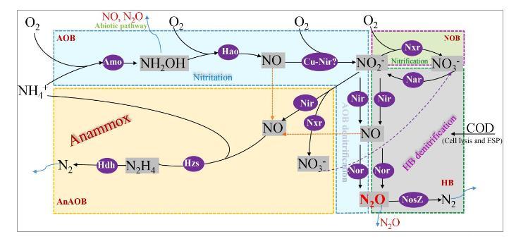 圖5、參與PN-A過程的關鍵功能微生物的主要代謝過程和通訊。以下酶進行氮轉化:Amo(氨單加氧酶)、Hao(羥胺氧化還原酶)、Nor(一氧化氮還原酶)、Cu-Nir(一種將NO氧化為亞硝酸鹽的未知酶)、Nxr(亞硝酸鹽氧化還原酶)、Nar(硝酸鹽還原酶);Nir(亞硝酸鹽還原酶)、NOR(一氧化氮還原酶)、NosZ(一氧化二氮還原酶)、Hzs(肼合酶)、Hdh(肼脫氫酶)。功能菌:紅色虛線框,AnAOB(Candidatus Kuenenia);藍色虛線框,AOB(亞硝化單胞菌);粉紅色虛線框,NOB(硝化螺);綠色虛線框。
