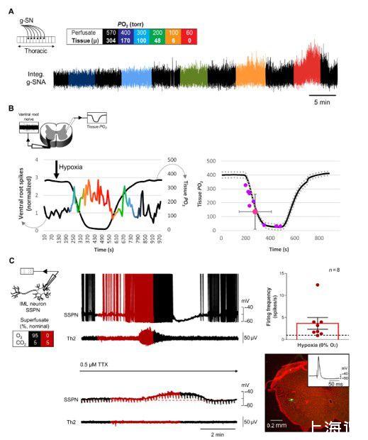 圖2、新生兒在原位灌注的胸脊髓和整塊橫向胸脊髓切片制劑中對(duì)缺氧的交感神經(jīng)反應(yīng)。(A)記錄新生兒(P2)g-SNA在單次灌注胸脊髓原位制備中對(duì)缺氧的反應(yīng)(左上角示意圖)。減少灌注液PO2會(huì)增加g-SN活性。方框:顏色編碼說(shuō)明了以托為單位的灌注液P O 2。曲線下的幅度和/或面積表示活動(dòng)水平。(B)使用Clark型微電極的IML組織P O 2測(cè)量,尖端低于組織表面100μm,對(duì)側(cè)腹神經(jīng)記錄來(lái)自整塊橫向胸脊髓切片制備(左上角示意圖)。作為組織PO2在14種制劑中的8種中,腹神經(jīng)活動(dòng)減少,腹神經(jīng)活動(dòng)增加。P O 2閾值響應(yīng)(如上定義)發(fā)生在140±121托(n=8)。(C)整體制劑中的單個(gè)IML SSPN(全細(xì)胞)和腹根神經(jīng)活動(dòng)(T2)。在1分鐘的峰值響應(yīng)期間,發(fā)射率增加了3.67±1.32峰值/秒(n=8)。在TTX中,缺氧使神經(jīng)元去極化3.1±0.98 mV(重復(fù)測(cè)量單向ANOVA;基線與缺氧,P=0.03;缺氧與沖洗,P=0.01;n=10)但對(duì)膜電阻沒(méi)有影響(1049±29兆歐;重復(fù)測(cè)量單向方差分析,P=0.5;n=10)。