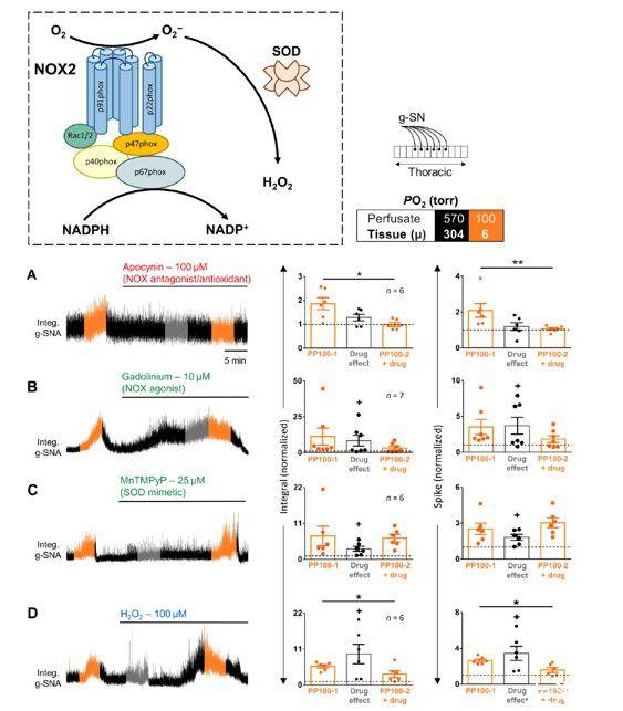 圖4、NOX和ROS在SOS中的作用。方框顏色編碼說(shuō)明了以torr為單位的灌注液PO2。左:大鼠原位胸脊髓制劑中g(shù)-SNA對(duì)缺氧的反應(yīng)(見(jiàn)示意圖)。在1分鐘間隔內(nèi)測(cè)量低氧反應(yīng)(灌注液和組織PO2,分別為100和~6 torr)和藥物效應(yīng),分別以橙色和灰色表示。右:分組數(shù)據(jù)。A夾竹桃麻素、NOX抑制劑;(B)釓、NOX激動(dòng)劑;(C)MnTMPyP,SOD模擬物;(D)H2O2,活性氧。