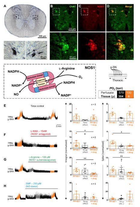 圖3、NOS1在SOS中的作用。(A)大鼠胸脊髓IML中NOS1的過(guò)氧化物酶免疫組化。(B和C)小鼠胸脊髓中NOS1(紅色)和ChAT(綠色)的雙熒光免疫組化。(D)合并NOS1和聊天標(biāo)記。IML(虛線方塊)在底部面板中被放大。(E到H)框:顏色編碼說(shuō)明灌注液的PO2。左:大鼠原位胸脊髓制劑中g(shù)-SNA對(duì)缺氧的反應(yīng)(見(jiàn)示意圖)。在1分鐘間隔內(nèi)測(cè)量低氧反應(yīng)(灌注液和組織PO 2,分別為100和~6 torr)和藥物效應(yīng),反應(yīng)最大,分別以橙色和灰色表示。右:分組數(shù)據(jù)。(F)L-NNA、NOS1阻斷劑;(G)L-精氨酸,NOS1激動(dòng)劑;(H)SNP,不依賴NOS的NO供體。