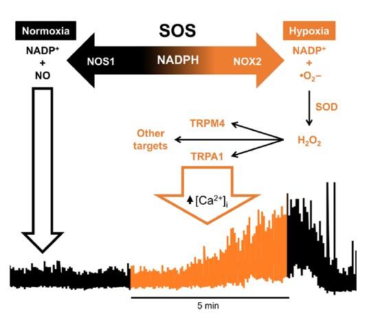 圖5、SOS氧傳感機(jī)制模型。兩種酶NOS1(神經(jīng)元NOS)和NOX2競(jìng)爭(zhēng)共同底物NADPH。NOS1在IML中非常豐富,并作為PO2依賴的NADPH。當(dāng)PO2下降時(shí),NADPH可用性增加,增加NOX2活性并產(chǎn)生超氧化物(·O2)和H2O2。ROS激活包括TRPA1和TRPM4在內(nèi)的多種受體,增加細(xì)胞內(nèi)鈣和SSPN活性。該模型意味著需要剩余量的氧氣來(lái)維持NOX產(chǎn)生ROS和SOS響應(yīng);即使組織P O 2為零保持,SOS失敗。