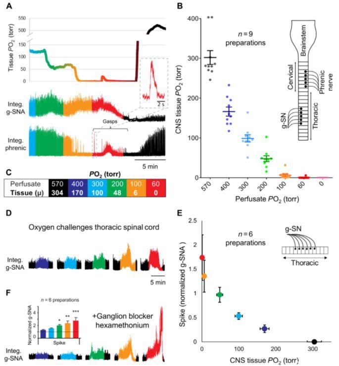 圖1、脊髓的氧敏感性保持在原位。(A和B)雙灌注原位制備,頸動(dòng)脈體和中樞神經(jīng)系統(tǒng)(CNS)(腦干和脊髓)隔室獨(dú)立灌注,證明灌注PO2和CNS組織之間的關(guān)系磷。使用Clark型極譜微電極(尖端直徑,<25μm)測(cè)量腦干中的中樞神經(jīng)系統(tǒng)組織氧合,而中央灌注液的氧合從570到60-torr PO2逐漸降低(PCO2保持在40 torr)以5分鐘步進(jìn)遞減。頸動(dòng)脈體灌注液始終保持恒定。隨著CNS的PO2進(jìn)入生理范圍,當(dāng)CNS的PO2嚴(yán)重缺氧時(shí)。(C)顏色編碼框總結(jié)了灌注液PO2和平均(μ)組織PO2之間的關(guān)系.(D和E)原位胸脊髓準(zhǔn)備證明g-SNA和(B)中建立的組織PO 2之間的關(guān)系.g-SNA標(biāo)準(zhǔn)化為50托的組織PO 2近似于體內(nèi)CNS常氧。(F)g-SNA反應(yīng)在存在神經(jīng)節(jié)阻滯劑六甲銨(100μM)的情況下在原位脊髓制備中持續(xù)存在,這表明氧敏感性不依賴于交感神經(jīng)鏈內(nèi)的突觸連接。