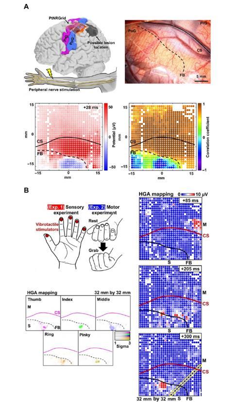 圖4:PtNR微電極網(wǎng)格放置與中央溝與相位反轉(zhuǎn)識別的M1-S1功能邊界的差異顯示(A)。右上、左、右面板分別顯示網(wǎng)格放置和識別的功能邊界(FB)相對于中央溝(CS)的位置。底部面板顯示了FB與CS的關(guān)系,這是通過基于潛力的圖(左)和相關(guān)系數(shù)圖(右)確定的。感覺和運動實驗范式示意圖及相關(guān)結(jié)果(B)。左下角的五組圖顯示了每個指尖在振動觸覺刺激下HGA的定位和強度。右側(cè)垂直的三個窗格顯示了手握開始后85ms,205ms和300ms時HGA在初級運動和感覺皮質(zhì)區(qū)域的進展情況。經(jīng)Tchoe et al.2022.7許可改編。