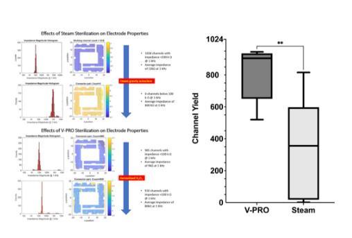 圖3:滅菌方式對PtNR網(wǎng)格阻抗和通道屈服的影響左圖給出了內(nèi)部MATLAB腳本的示例輸出,該腳本用于在PtNR網(wǎng)格上進行阻抗和通道屈服測試。請注意,與V-PRO相比,蒸汽高壓滅菌后阻抗中值增加更大(見內(nèi)嵌阻抗大小直方圖)。右圖顯示了V-PRO和蒸汽滅菌方法后可用通道的差異。非參數(shù)Mann-Whitney u檢驗比較蒸汽滅菌的PtNR柵格(n=7)和V-PRO(n=20)的通道產(chǎn)量表明,V-PRO保存的通道數(shù)量明顯更多(905個[650.8-935.5]比356個[18.0-597.8],p=0.0031)。