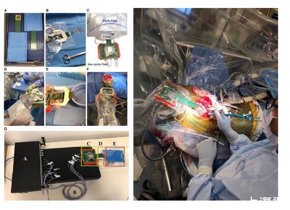 圖2放置在滅菌托盤中的DuraHolder袋中微電極網(wǎng)格(a)。擴展板穿過情境?無菌膜,并由Tegaderm固定以形成無菌屏障(B)。然后將綠色擴展板連接到放大板(C),然后從內(nèi)部拉出膜。由一名團隊成員制作的非無菌表面,覆蓋放大器板和相關(guān)的出線電纜(D)。然后用無菌鹽水(E)進行阻抗和通道產(chǎn)量測試。一旦定位正確,使用格林伯格或C夾用于將放大器板固定在適當(dāng)?shù)奈恢?F)。記錄設(shè)置如圖(G)所示。Intan放大器A通過8根SPI電纜連接到放大器板b,放大器板C分別連接到擴展板和柵格D和E。右面板展示了資深作者在術(shù)中使用微電極網(wǎng)格。