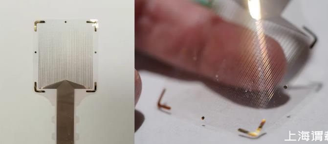 圖1使用的范例微電極網(wǎng)格(特別是PtNR網(wǎng)格)的照片。注意電極觸點是肉眼看不見的。右邊是網(wǎng)格相對于手指的照片,來表示微電極接觸的緊湊程度