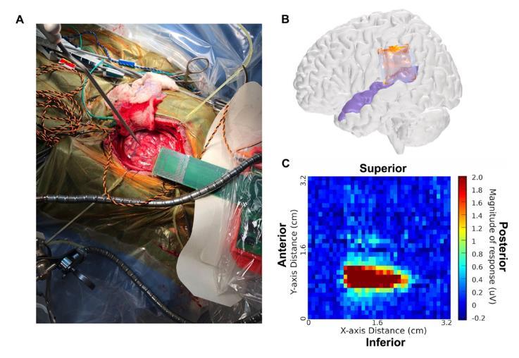 圖6:術(shù)中照片顯示PtNR微電極網(wǎng)格相對于顳頂開顱術(shù)的位置(A)。插圖描繪了ptnr網(wǎng)格相對于顳上回(STG)的位置(淺紫色)(B)。熱圖顯示了聽覺語言刺激通過PtNRGrid通道傳遞后500-600ms的平均皮層反應(yīng)程度(C)。注意深紅色顯示的水平長方形區(qū)域反應(yīng)特別強烈。