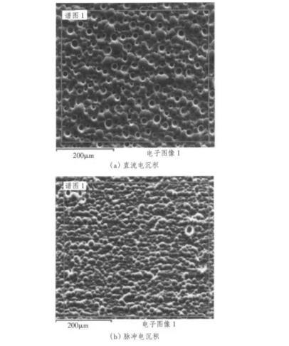 圖2是脈沖電沉積和直流電沉積制備出的Ni-Mo合金電極的掃描電鏡圖。從圖中可以看到,脈沖電沉積得到的Ni-Mo合金的晶粒比直流電沉積更加細(xì)小,且表面的孔洞大大減少。在脈沖電沉積中,陰極表面缺少的金屬離子能及時從溶液中得到補充,擴(kuò)散層基本被消除[4],而使電解液中金屬離子濃度趨于一致,從而改善了鍍層質(zhì)量。