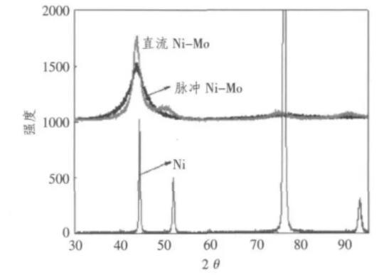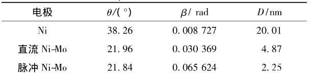 圖3為不同電極時的XRD衍射譜圖。從XRD圖可以看出,Ni-Mo合金鍍層的衍射曲線與Ni的完全不同,說明Ni-Mo合金電沉積過程中形成了不同于Ni的物相結(jié)構(gòu)。對比直流電沉積和脈沖電沉積Ni-Mo合金鍍層可以發(fā)現(xiàn),脈沖電沉積Ni-Mo合金的XRD衍射峰更進(jìn)一步寬化,說明鍍層的晶粒進(jìn)一步細(xì)化。由Scherrer公式得到晶粒尺寸大小見表4。