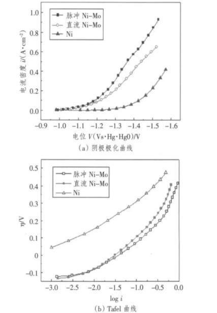 采用三電極系統(tǒng)動電位掃描測定電極的陰極極化曲線。電解液為30%(wt)的氫氧化鉀溶液,掃描速度10 Vs-1。分別以脈沖電沉積和直流電沉積制備的Ni-Mo合金電極為工作電極,輔助電極采用大面積鉑網(wǎng),自制Hg/HgO電極為參比電極。所用的測試儀器為美國EG/G公司生產(chǎn)的M273電化學(xué)工作站。