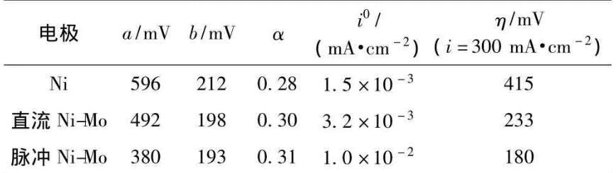 從表2可以看出,3種電極反應(yīng)的傳遞系數(shù)α相差不大,但是交換電流密度i0差距卻很大,其中直流Ni-Mo合金電極的i0是Ni電極的2倍,而脈沖Ni-Mo合金電極的i0是直流Ni-Mo合金電極的3倍多,是Ni電極的6倍多。交換電流密度i0是系統(tǒng)動態(tài)性質(zhì)(即反應(yīng)速度)的反映[3],在對稱系數(shù)α相差不大的情況下,i0越大反應(yīng)越容易進(jìn)行,其過電位η也越小。