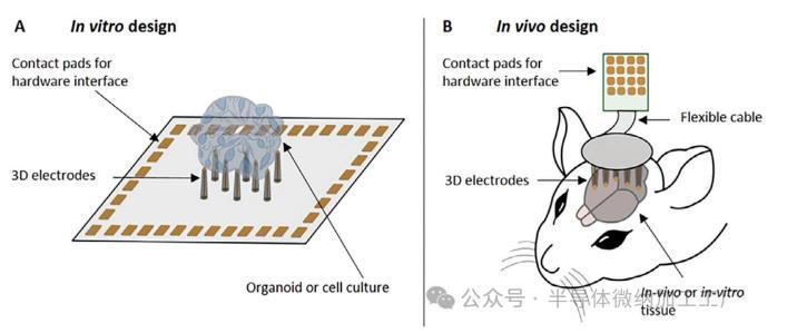Fig1:3D MEA的應(yīng)用方式。A)體外設(shè)計(jì)通常將培養(yǎng)皿和3D MEA直接集成在芯片上,代表可用于球體、類器官和急性神經(jīng)切片的獨(dú)立設(shè)備。B)體內(nèi)設(shè)計(jì)將MEA與神經(jīng)元組織分離,其中MEA單獨(dú)制造在(柔性)基板上,并通過(guò)倒裝芯片粘合到印刷電路板上。連接到顯微操作器后,可以在體外和體內(nèi)實(shí)驗(yàn)中降低探針以穿透神經(jīng)元組織。