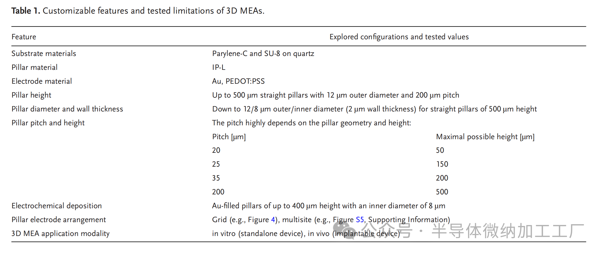 為了簡(jiǎn)化穿透MEA的空間布置,在下文中,3D MEA將指包含多個(gè)突出微電極或穿透軸的MEA。因此,已經(jīng)使用微電子制造技術(shù)制造了用于連接神經(jīng)元組織的各種類型的3D MEA,其主要涉及在基底的頂部或底部表面上沉積或生長(zhǎng)電極材料(例如金屬、碳、陶瓷等)。近年來(lái),MEA制造方法擴(kuò)展到還包括使用噴墨打印作為圖案化工具直接在聚二甲基硅氧烷(PDMS)、瓊脂糖和明膠基材上制造軟MEA,這也允許快速原型制作方法。此外,噴墨印刷已用于在平面MEA基板上制造3D微電極。通過(guò)打印納米粒子,開(kāi)發(fā)了軸高度、直徑和路徑任意變化的高密度3D MEA,并將其應(yīng)用于體內(nèi)實(shí)驗(yàn)。此外,立體光刻3D打印已與金屬電極的油墨鑄造和電鍍相結(jié)合,用于在孔板中制造3D MEA。盡管如此,這些方法的印刷分辨率有限,低至數(shù)十微米,需要具有高楊氏模量的導(dǎo)電油墨,從而導(dǎo)致更高的橫截面足跡,并且缺乏或需要額外的步驟來(lái)實(shí)施用于鈍化印刷電極的絕緣層。