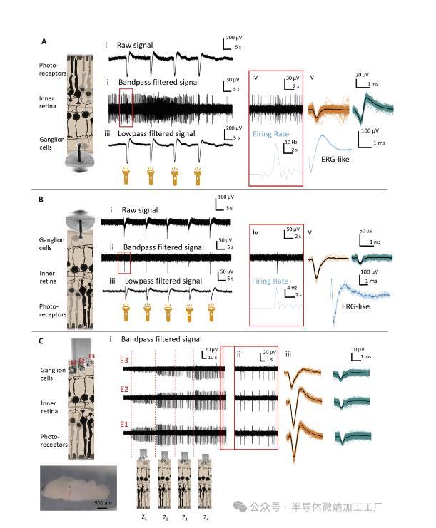 Fig3:摘除嚙齒動(dòng)物視網(wǎng)膜的體外記錄。使用體外A)和體內(nèi)B)方法進(jìn)行視網(wǎng)膜記錄,顯示原始電信號(hào)(A-B)、尖峰活動(dòng)(帶通濾波信號(hào))(A-B ii)和局部場(chǎng)電位(低通濾波信號(hào))(A-B iii)在光學(xué)刺激下捕獲。A和B中各個(gè)光學(xué)響應(yīng)的快照表明,尖峰信號(hào)(黑色跡線)的放電速率(藍(lán)色跡線)在光刺激時(shí)增加(A-B iv)。在(A-B v)中顯示了不同的神經(jīng)波形。此外,在這兩種情況下,記錄了代表視網(wǎng)膜總活動(dòng)的四到五個(gè)刺激的平均ERG波形(藍(lán)色)。C)插入包含三個(gè)電極的多位點(diǎn)柱,每個(gè)電極的高度差為20μm。記錄顯示逐步插入后多部位柱的視網(wǎng)膜內(nèi)放置(Z 1–Z 4)。此外,還顯示了Z 4(C ii,紅色窗口)處的記錄提取物和單個(gè)多位點(diǎn)柱內(nèi)各個(gè)電極(C iii)捕獲的尖峰波形。
