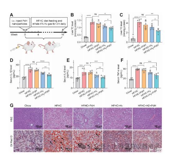 圖4、PdH注射加氫氣吸入預(yù)防輕度NASH的治療效果。輕度NASH預(yù)防(A)、肝臟總膽固醇(B)和甘油三酯(C)含量、涉及IL-1β(D)、IL-6(E)和TNF-α(F)的全身炎癥水平的治療程序,以及治療結(jié)束時肝切片的H&E和油紅O染色(黑色箭頭指向代表中性甘油三酯和脂質(zhì)的紅點)圖像(G)。