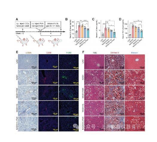 圖5、PdH注射加氫氣吸入緩解中度NASH的治療效果。模型構(gòu)建和治療程序(A),血清細(xì)胞因子水平包括IL-1β(B),IL-6(C),TNF-α(D),IHC和α-SMA,CD68和F4/80的免疫熒光檢測肝切片(E)的水平,以及治療結(jié)束時肝切片的H&E、油紅O(指向代表中性甘油三酯和脂質(zhì)的紅點的黑色箭頭)和馬松三色染色(藍(lán)色代表膠原蛋白)圖像(F)。