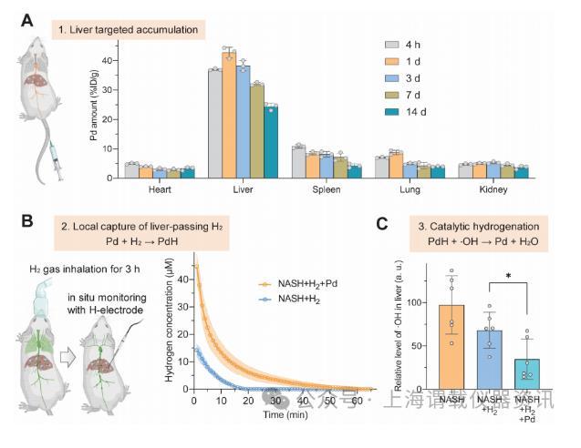 圖3、Pd納米顆粒在NASH模型中的肝臟靶向積累、局部氫捕獲和催化氫化行為。靜脈注射后Pd納米顆粒的生物分布和肝內(nèi)滯留(A),通過氫電極實時原位監(jiān)測NASH小鼠注射Pd和3小時氫氣吸入后肝臟中的氫濃度(n=6)(B),Pd納米顆粒催化氫化清除NASH小鼠肝臟中·OH的能力(C)。