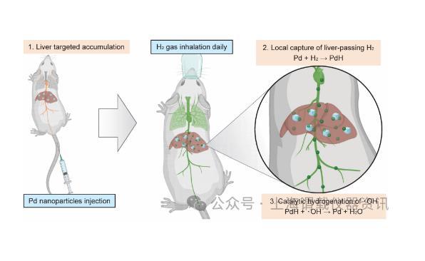 圖1、Pd納米粒子在肝臟中進(jìn)行局部氫捕獲和催化?OH氫化的治療策略和機(jī)制示意圖。