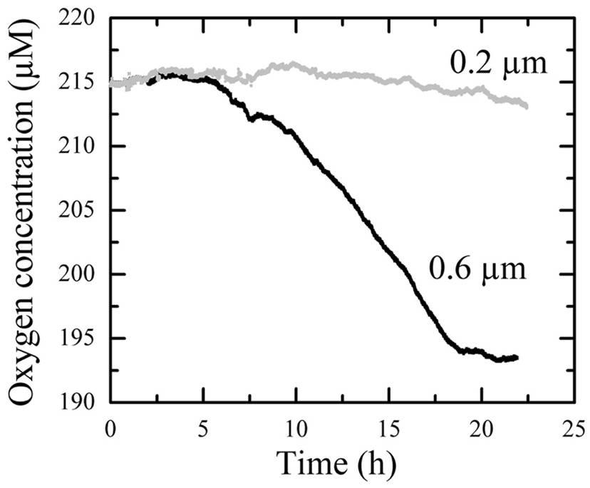 圖1、在黑暗環境下培養孵化后的樣本經過0.2um和0.6um的微濾膜過濾后的次級樣本的氧濃度隨時間的變化情況。