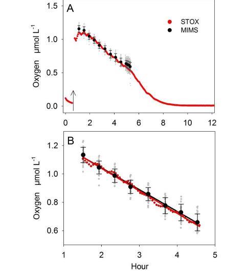 圖5、比較膜入口質譜法(MIMS)和安培電流法(STOX)傳感器(unisense氧微電極)。O2的濃度和消耗率測量后,添加1.2 umol 18-18O2 L-1(圖A箭頭所示.單個MIMS法的測量值(灰色點)取平均值(黑點),并用相應的點表示標準差。整個實驗運行3小時同時測量。(B)用于氧的消耗速率計算。